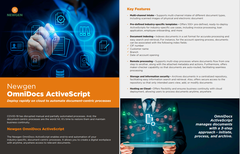 Newgen’s OmniDocs ActiveScript enables rapid cloud deployment for the automation of your industry-specific, document-centric processes. It digitally co-locates your remote employees and documents. The solution restores your disrupted operations and helps maintain business continuity by creating a digital workplace with anytime, anywhere access to relevant documents.